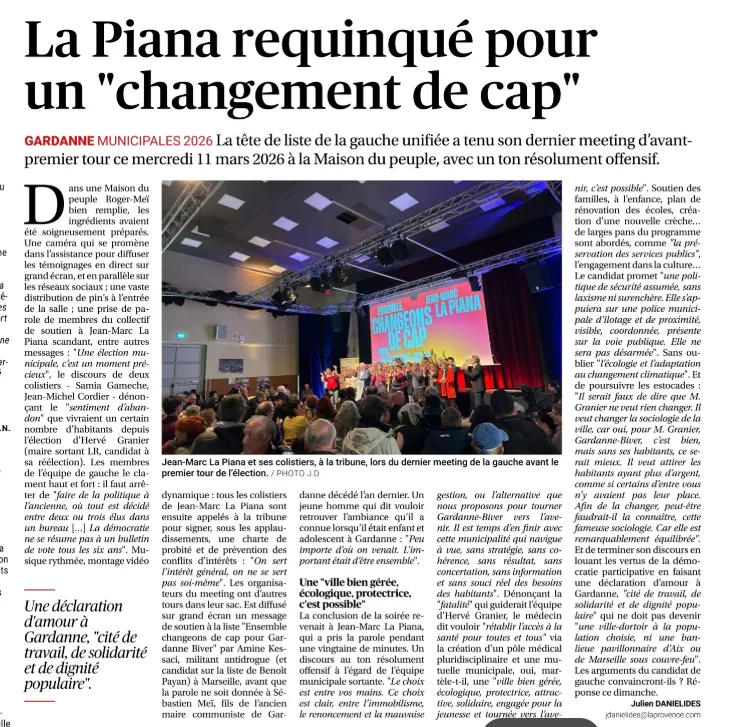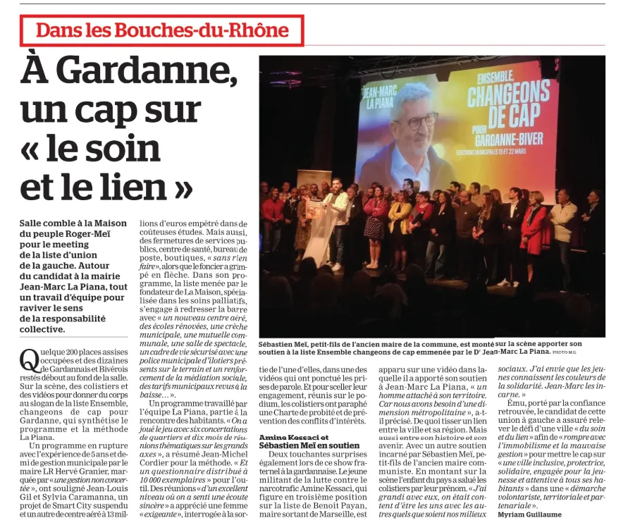 Nous étions plus de 300 personnes hier soir réunis à la Maison du Peuple, à quelques jours du premier tour. Jean Marc La Piana a pu détailler sa vision solidaire, sociale, écologique pour notre ville et a posé clairement l'alternative entre une ville qui se recroqueville ou une ville qui décide de prendre en main son avenir!